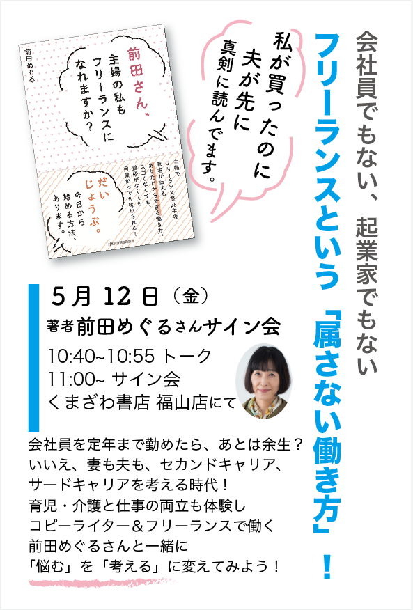 広島県・福山市・くまざわ書店さんでミニトーク&サイン会『前田さん、主婦の私もフリーランスになれますか?』